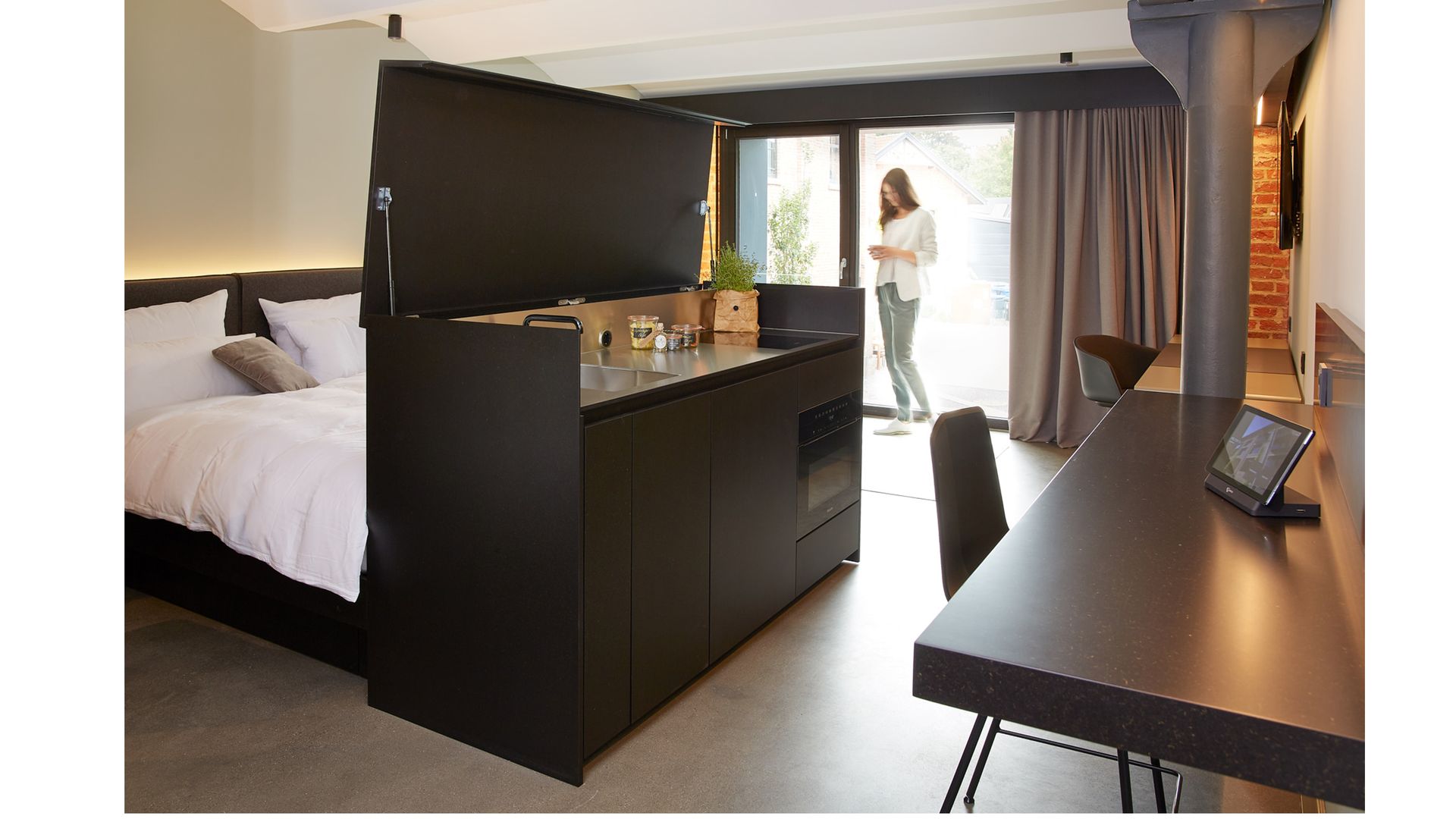 Mehr als ein Hotel: Im PÖLTER sind alle Studios und Lofts mit Küche und Sitzbereich ausgestattet. Durch die unterschiedlichen Grundrisse des historischen Gebäudes gleicht kein Raum dem anderen. Daraus ergeben sich einige Besonderheiten. Beispielsweise wurde die Küche in einigen Studios als integrierte Pantryküche geplant, die direkt am Fußende der zwei Meter langen Queen Size-Betten platziert ist. So ist das bequeme Bett zwar etwas für Langschläfer, aber nicht unbedingt für „lange Schläfer“. Eine offene Raumgestaltung gehört zum Designkonzept im PÖLTER. Daher kommt in den halboffenen Bädern, die nicht als separater Raum angelegt sind, getöntes Glas zum Einsatz, welches Ein- und Ausblicke gewährt.